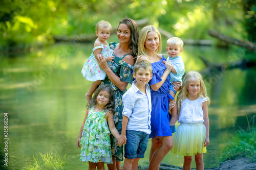 © ElenaBatkova, Obraz premium Two mothers with children in the forest near the river.
