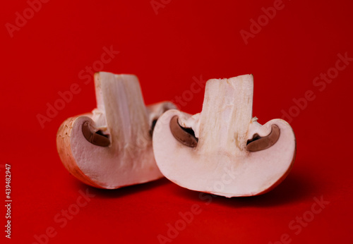 Fototapeta premium two mushrooms of mushrooms in a cut on a red background