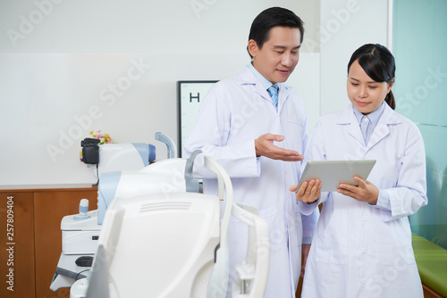 © DragonImages, Fototapeta premium Two oculist working in team using tablet pc