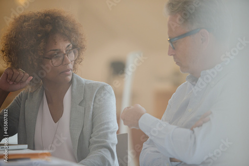 Obraz premium Two office workers talking at desk using laptop