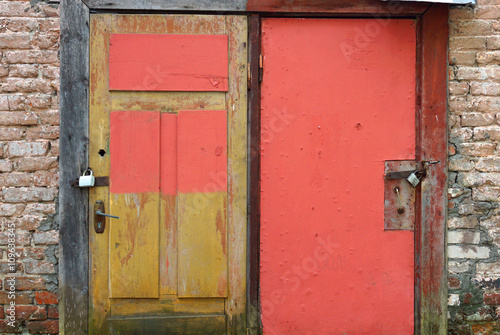 © rannica, Naklejka premium Two old colorful wooden door with peeling paint and background for text