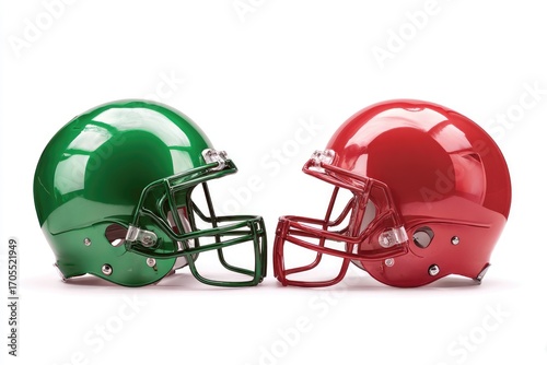 Fototapeta premium Two opposing football helmets, green and red, face off (1)