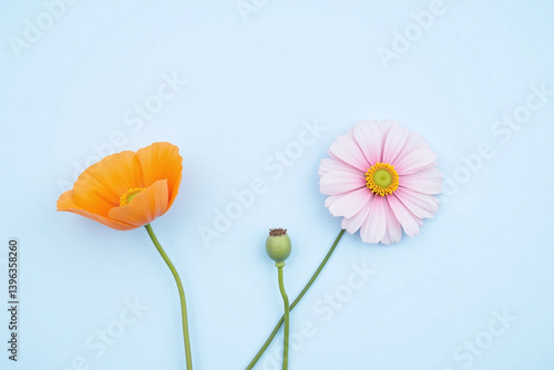 © Ease Enjoy, Naklejka premium two orange and pink flowers on a blue background