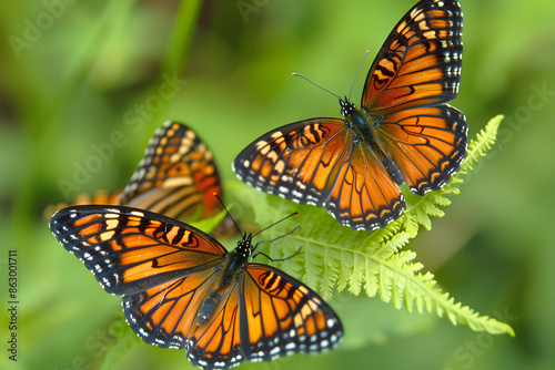 Naklejka premium Two orange butterflies are sitting on a green leaf