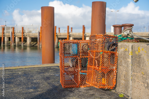 Naklejka premium Two orange fishing cages rest on a pier near rusty poles and mooring ropes....