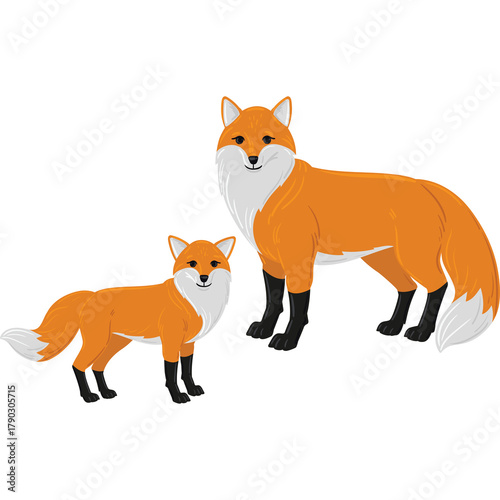 © Denada, Fototapeta premium Two Orange Foxes With White Accents Stand Side By Side On A Transparent Background One Larger Than The Other And Facing Forward