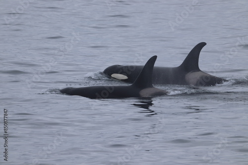 Fototapeta premium Two Orca, Killer Whales, side by side swimming from right to left
