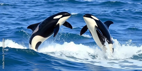 © Thiti, Obraz premium Two orcas breach, playful mid-air acrobatics amidst surging ocean waves, orcas, sea