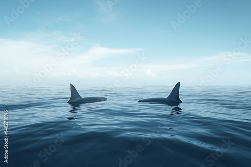 © khozainuz, Fototapeta premium Two Orcas Gracefully Swimming in the Vast, Serene Waters Under a Pastel Sky