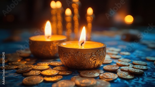 Obraz premium Two ornate candles burning brightly amidst gold coins on a dark blue surface,...
