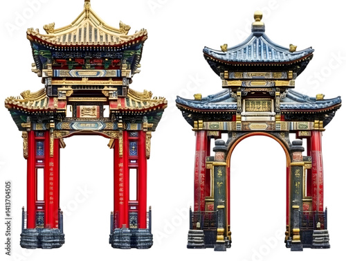 © Siasart Studio, Fototapeta premium Two Ornate Traditional Chinese Gates Against a Transparent Background Photo