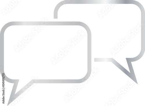 Naklejka premium Two overlapping rectangular 3x2 aspect ratio silver metallic talk balloons, rounded corners. Blank outline dialogue boxes with sharp, downward-pointing triangular tails on transparent background.