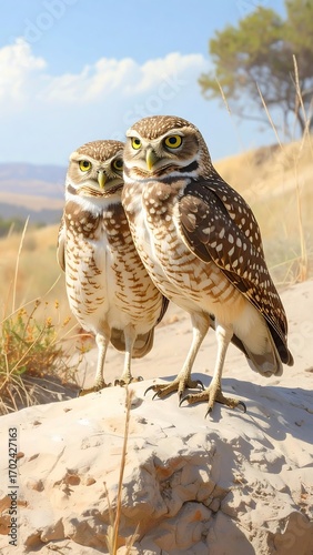 © Selalu, Fototapeta premium Two owls perched on a sand dune