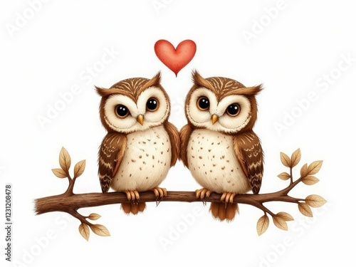 Fototapeta premium Two Owls Perched on Branch Sharing a Heart