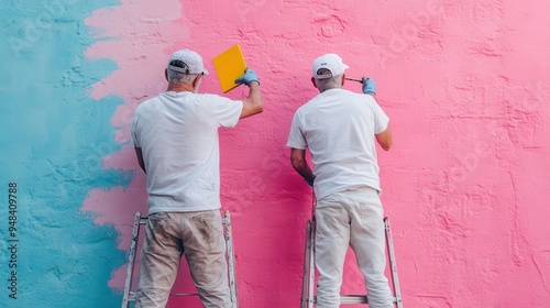 © JoxyAimages, Obraz premium Two painters, dressed in white uniforms, are working together to paint a wall with a striking two-tone color scheme, using blue and pink paint on their ladders.