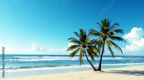 © Agus, Fototapeta premium Two palm trees on a sandy tropical beach with turquoise ocean waves and blue sky
