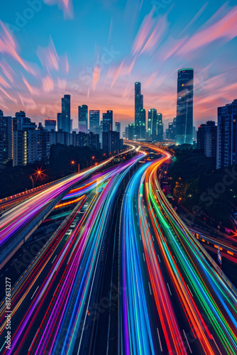Fototapeta premium Two parallel expressways cutting through the cityscape, stretching into the distance. Rather than traditional vehicle lights, the expressways are illuminated with vibrant, swirling lights