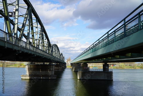 © Eva, Obraz premium two parallel railway bridges over Donnau river in Vienna on a bright sunny day
