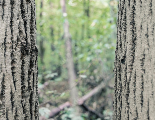 © Cristi, Obraz premium Two parallel trunk trees in the forest with blurred bokeh background. Close up between two trees..