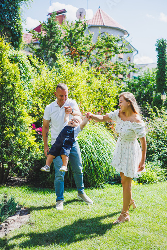 Fototapeta premium Two parents are playing on a walk with their toddler son. A young married couple, a man, a woman and a little son, are walking in the park. Time for a walk, mom, dad and small child.