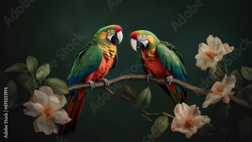 © Unionproject, Fototapeta premium Two parrots on a branch with flowers blooming around them. for something tropical. Generative AI
