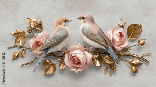 Obraz premium Two pastel-colored birds perched among elegant golden branches with pink rose...