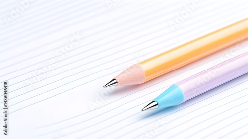 © sonswirl, Fototapeta premium Two pastel-colored pens rest on lined paper