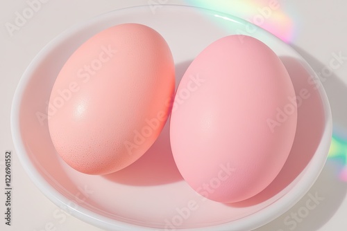 Fototapeta premium two pastel peach eggs neatly placed on white ceramic plate surrounded by subtle reflections of light