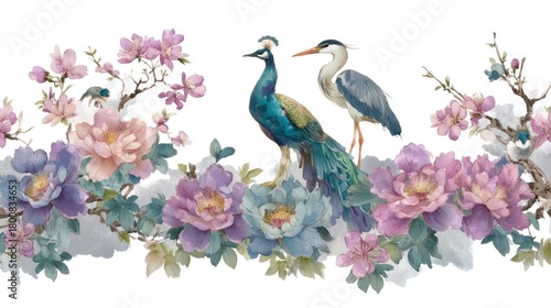 © Soklin, Obraz premium Two peacocks and a heron perched on a branch with pink and purple flowers, set against a white background with soft shadows and highlights, creating a serene and natural ambiance.
