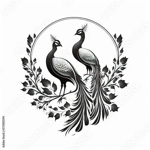 © Whitefeather, Naklejka premium two peacocks black and white 2D minimalist luxury logo vector logo on white background Generative AI