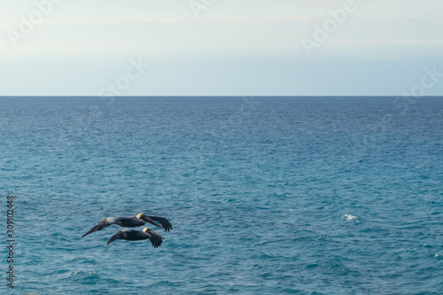 © Prozhekter , Obraz premium Two pelicans fly against the background of bright blue water. Atlantic ocean. Varadero, Cuba