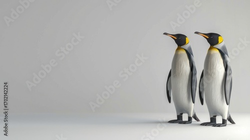 © kammat, Fototapeta premium Two Penguin Figurines Standing on White Surface Against Light Gray Background