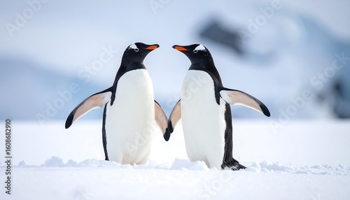 Naklejka premium Two penguins face each other on snowy ground, wings slightly outstretched