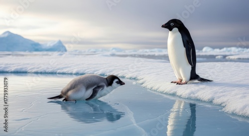 © O_studio, Obraz premium Two penguins interact on icy landscape