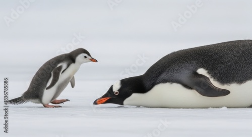 © O_studio, Naklejka premium Two penguins interacting on a snowy surface, one lying down and the other standing.