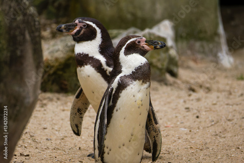 Fototapeta premium Two Penguins on Sandy Ground. Two penguins, Spheniscus humboldti standing on...