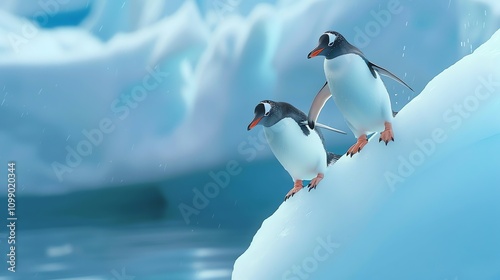© Galib, Obraz premium Two penguins perched on an iceberg in a frosty landscape,