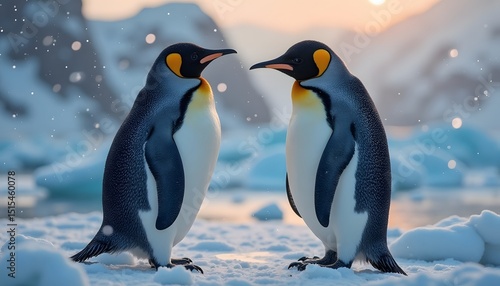 © Rifki Fachrudin, Fototapeta premium Two penguins stand on snowy ground with mountains and a sunset in the background