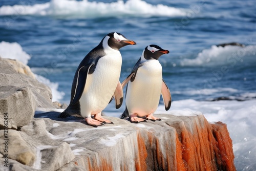 © pham, Obraz premium Two penguins standing atop a rock in their natural habitat.