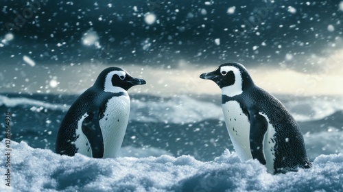 © Elginstock, Obraz premium Two penguins standing in the snow during a snowy, cold environment by the ocean.