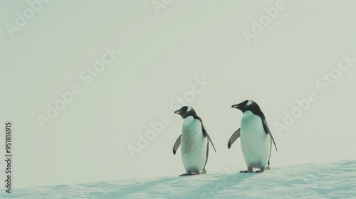 Fototapeta premium Two penguins standing on a snowy landscape, facing each other in a serene,...