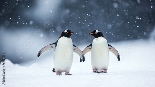 © BerkahStock, Fototapeta premium Two penguins standing together in a snowy landscape during a snowfall.