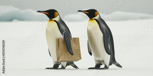 © AiAbstract, Fototapeta premium Two Penguins Waddle Side by Side, Each Carrying a Brown Paper Bag in a Cold Icy Environment Against a Soft Blur of Icebergs in the Background