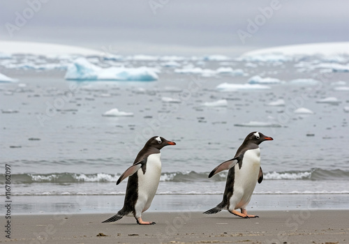 Obraz premium Two penguins walking on the seashore in Antarctica, close-up, full size....