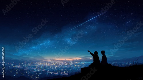 © Formoney, Fototapeta premium Two people are looking up at the sky, pointing at a shooting star. The scene is set in a city at night, with the city lights visible in the background. Scene is peaceful and romantic
