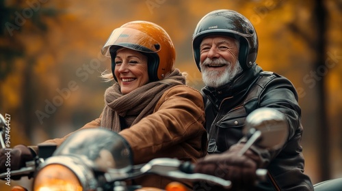 Fototapeta premium Two people are riding a motorcycle, one of them is smiling