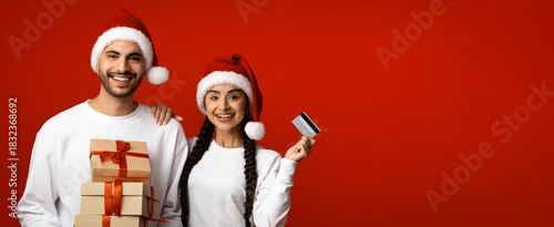 © Prostock-studio, Naklejka premium Two people are smiling joyfully while wearing Christmas hats. One holds a stack of wrapped presents, while the other displays a credit card, showcasing holiday spirit and excitement.