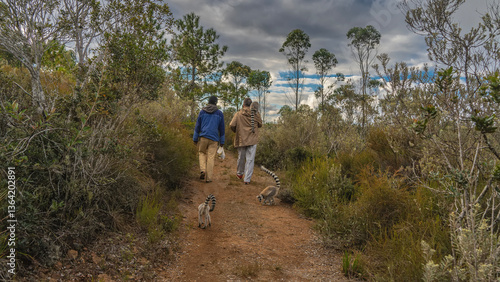 © Вера , Fototapeta premium Two people are walking along a red dirt dirt road. Ring-tailed catta lemurs are perched on the shoulder, frolicking on the path. Tall grass on the roadsides. View from the back. Madagascar.