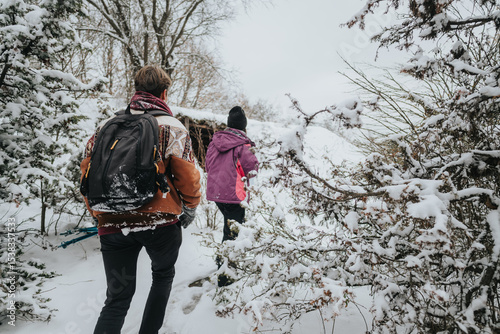 © qunica.com, Naklejka premium Two people hiking along a snowy forest trail surrounded by trees covered in fresh snow, experiencing the serene outdoors.