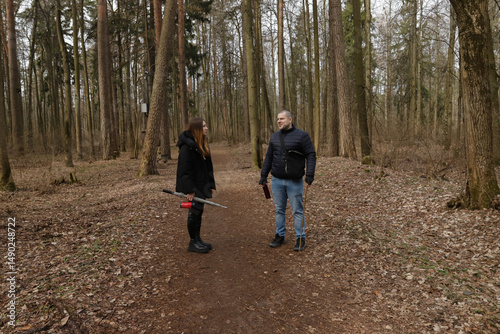 Fototapeta premium Two people on a tranquil nature walk, exploring a winding path lined with bare trees and forest undergrowth, dressed warmly for the chilly air in dark coats and boots.